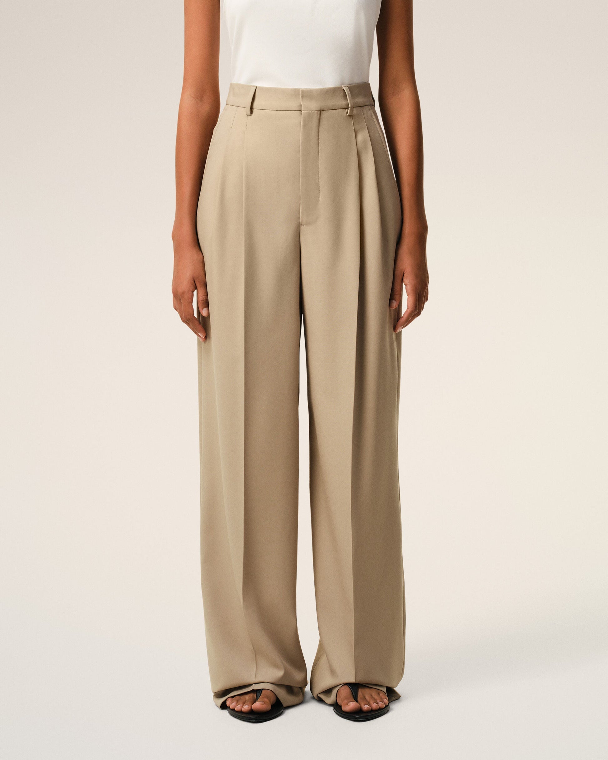 Pantalon Large Beige Taille Haute en Laine Vierge